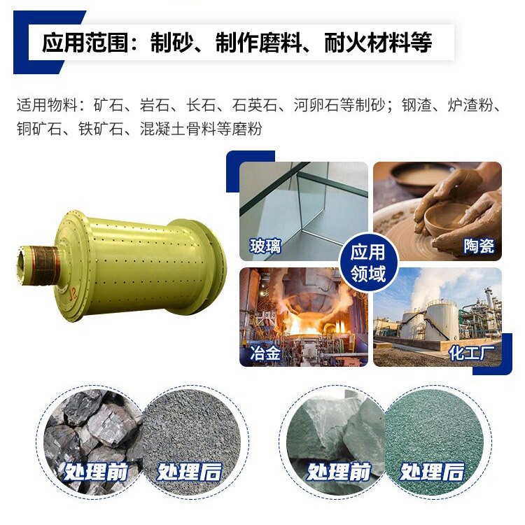 二、出料均匀产量高——采用先进的可控进出料棒磨机技术,结合实际用户的研磨物料配用合适的研磨体,一改传统球磨机的面接触为线接触,使制砂机的出料粒度更为均匀、产量更高, 适用于不同硬度(莫氏硬度 5.5 ~ 12 )的矿石。